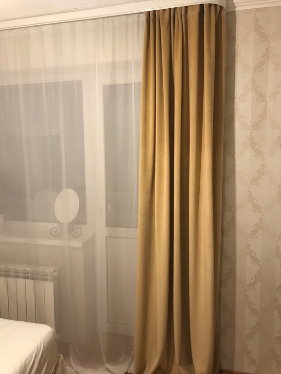 Слева, перед стулом выход на балкон, справа дверь в гостинную. На стуле лежит бархат горчичного цвета, была мысль пошить из него шторы, но мучают смутные сомнения, -