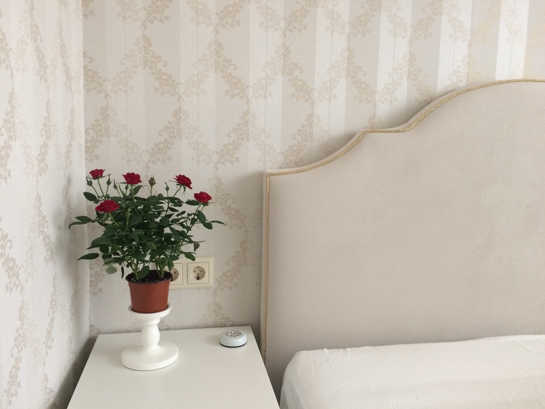 После покупки квартиры 2 года назад сделала ремонт в спальне,т.е. переклеила обои, покрасила потолок ( он оклеен обоями), ламинат не меняла. Облагородила икеевскую кровать Рикене, купила в Икее белые тумбочки и шкаф. Теперь необходимо добавить цвет в комнату, а то как-то все бледненько получилось. Какая сюда подойдет люстра, настольные лампы, какого стиля. Хочется добавить черные акценты, но какие? и уместны ли они будут?