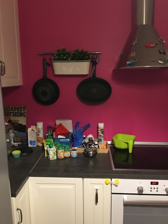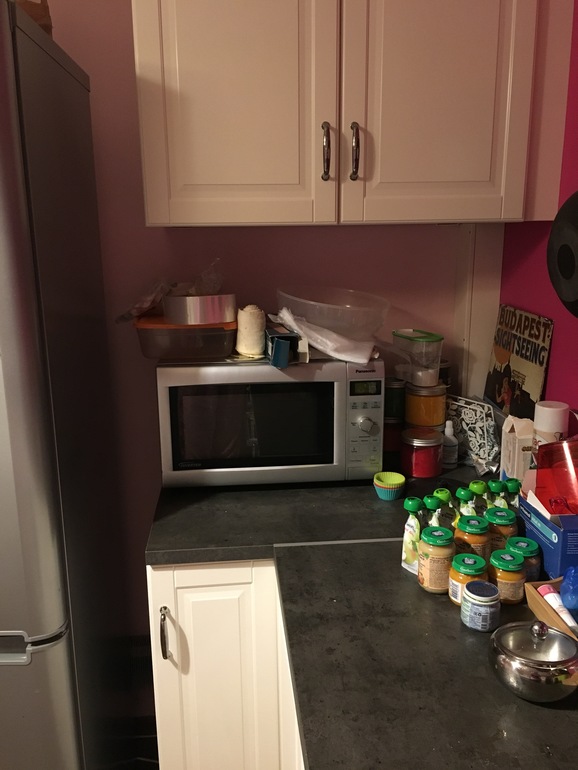 Что имеем - микроволновка там стоит и чайник... соответственно муж вечно оставляетесь сахар, пакетики с чаем, ещё там поднос для масел и приправ планировался, но видимо в него очень удобно кидать всякую мелочь типа лекарств, капель в нос, витаминов, вечно какие-то коробочки там скапливаются... детские банки в той стороне тоже...