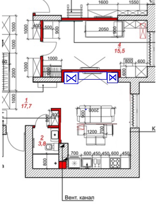Сан узлы на своих законных местах, кухня чуть увеличивается за счет комнаты - но у нас в данной ситуации это согласуемо.