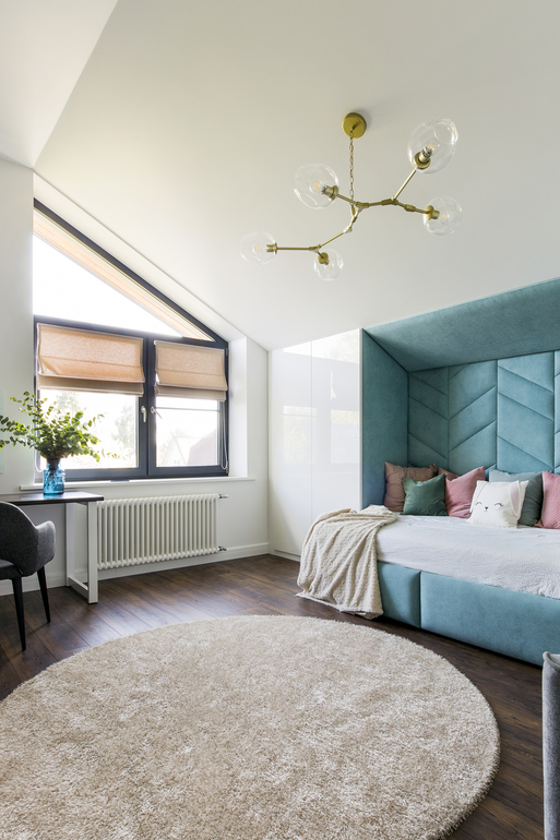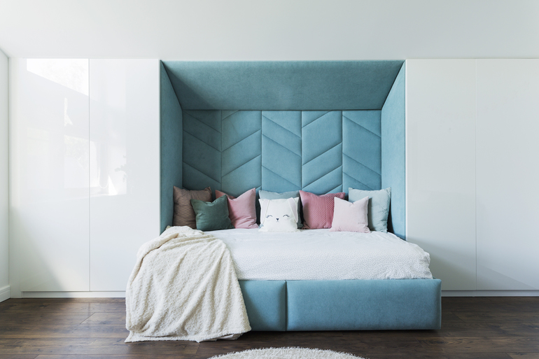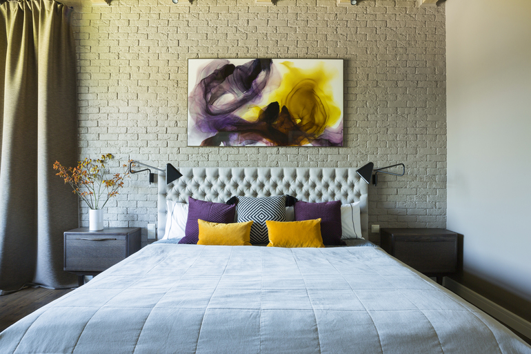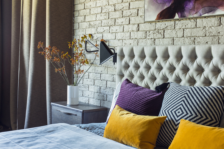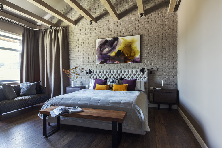 Спальня. Одна стена отделана гипсовым кирпичом, но покрашена так же, как и все стены и потолок одним тоном.
