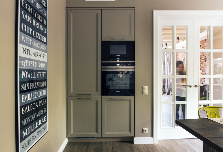 Высокие элементы встроены справа и слева от входа и цвет подобран так, чтобы не брать на себя внимание и максимально сливаться со стенами. Основная часть кухни с рабочей поверхностью - белая. Посудомоечная машина справа от мойки, сушка для посуды в выдвижных ящиках слева от мойки.