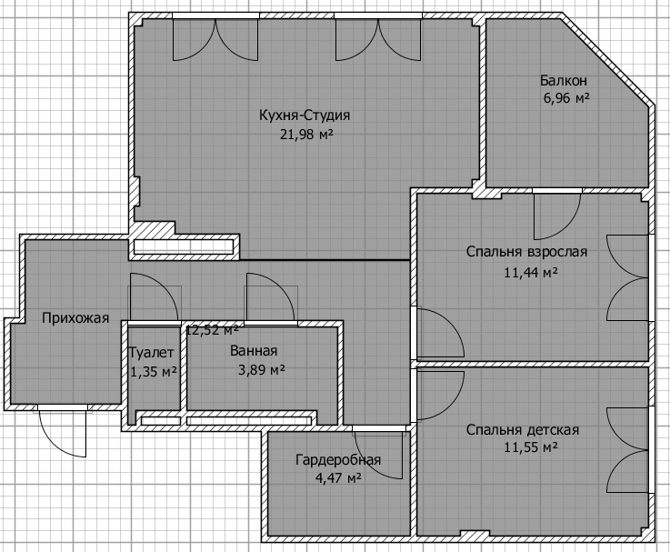 Если это жилье для Вас временно, то сильно не стала бы углубляться в перепланировку. Просто объединила кухню с комнатой, получив из трешки двушку. Оставлять кухню и три жилых комнаты - это просто очень много комнатенок будет на данной площади. Или это недострой без стен?