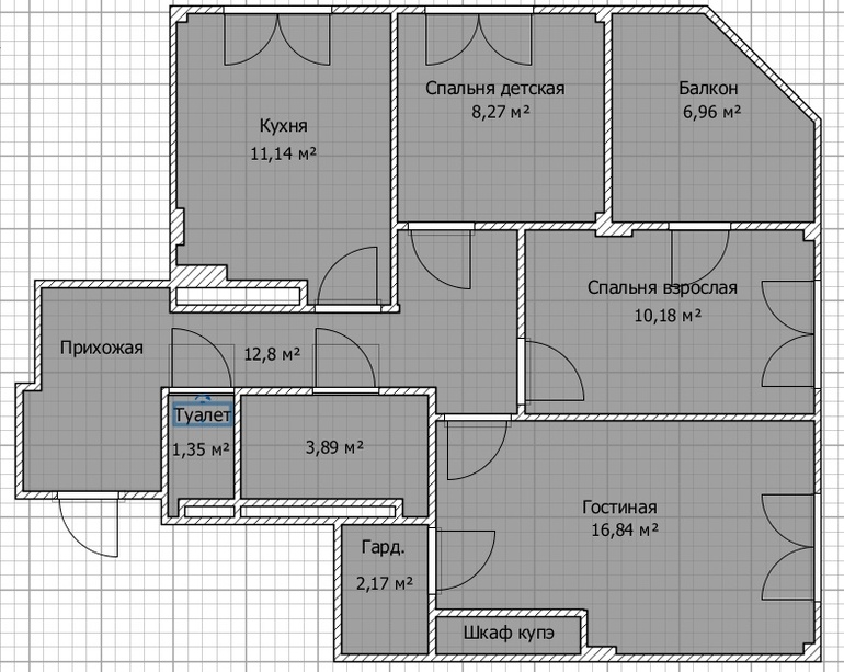 Последний вариант самый интересный. Объединение кухни и гостиной расширяет пространство. Только я бы продлила немного стенку между гостиной и коридором, чтобы дверь с/у не выходила в гостиную. И детская маловата для двоих. На мой взгляд, лучше немного пожертвовать гардеробной и прихватить коридорчик. А гардеробную, по возможности, организовать на балконе.
