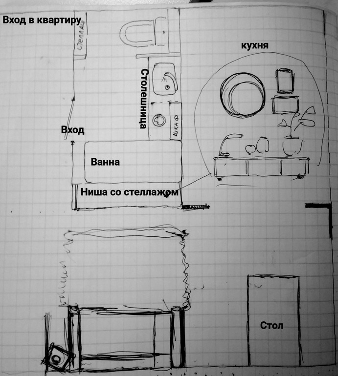 Кухню не уменьшить, так как на кухне широкое окно и стояк, там получится только см10 выиграть, смысла нет. В комнате будет обеденная зона и гостиная, все миниатюрно, но все входит и удобно получается.