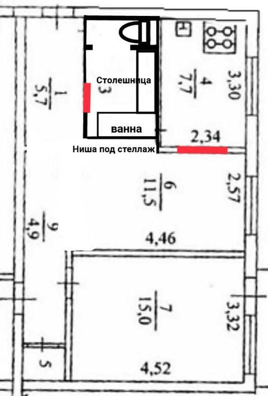 В общем, есть трехкомнатная квартира в брежневке. Собираемся делать санузел. Планировка у нас "огонь". Очень смущает, что дверь в туалет находится впритык к входной. По этой причине, ну и по причине маленьких площадей хотим совместить санузлы. Туалет хотим оставить на месте, сделав в стене типо дверного проема. А ванную часть комнаты увеличить за счет части коридора. Получится дверь санузла вынести в прихожую, но все таки на полтора метра дальше от входной.