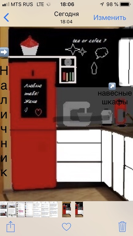 Рисунок весьма условный, попробую пояснить подробнее. Серым цветом обозначен фартук из плитки. Над ним до потолка зона окрашена чёрной грифельной краской. Грифельная краска имеет продолжение за холодильником и идёт сплошняком от потолка до пола. Все остальные участки стен в кухне выкрашены в бежевый оттенок.