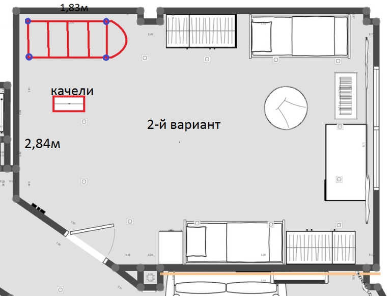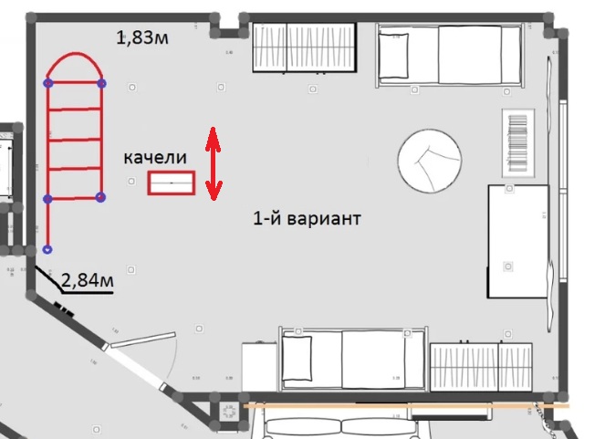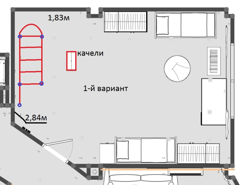 Отличаются расположением лестницы и видом турника. Располагать в комнате их буду так (красный прямоугольник это качели, подвешенные к потолку):