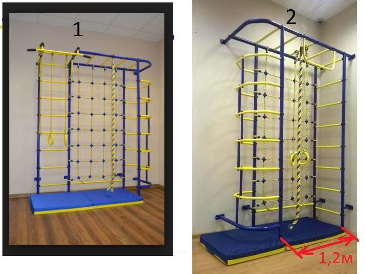 Предыстория: Изначально выбрала я для детской вариант комплекса на 2-й картинке и запланировала поставить его вдоль стены 1,83 м (смотри картинки). И уже даже сделали крюки в потолке для качелей. Теперь я сильно сомневаюсь в удобстве этого комплекса. Думаю, что детям будет "тесно" внутри этих лестниц, да и турник какой-то странный (или норм?). В варианте №1 лестница развернута. И поэтому в простенок 1.83м этот ДСК не поместится. Стоит ли выбрать вариант №1, развернуть его на соседнюю стену и переделать крюки под качели?