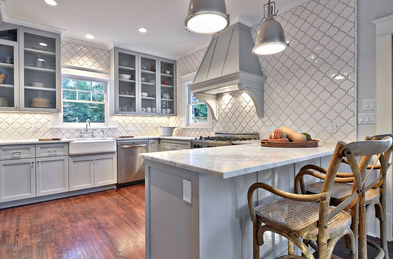 В пару к такому фартуку можно было бы поставить темно-синие стулья или поклеить обои с синими элементами....