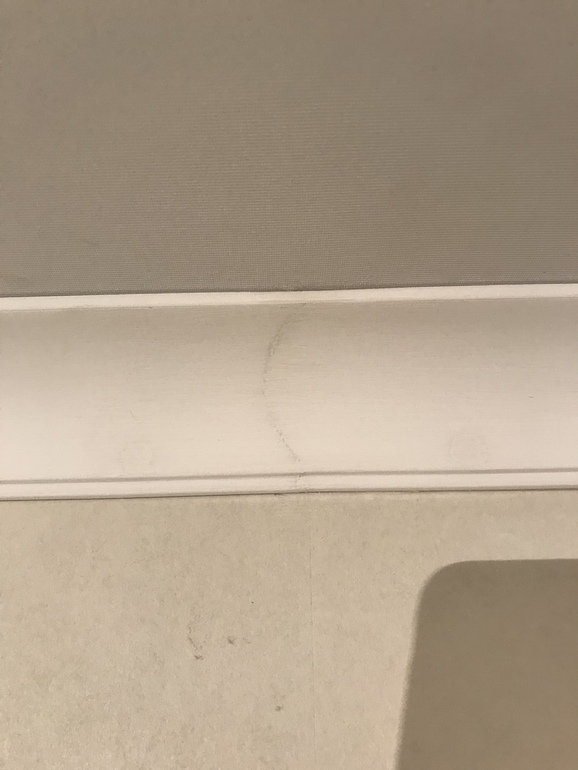 Также у вас на фото видны зазоры между плинтусом и потолком (стеной). Их быть не должно. У нас стены и потолок неровные и все зазоры заделывали монтажным клеем Орак, в результате кривизна стен вообще не видна.