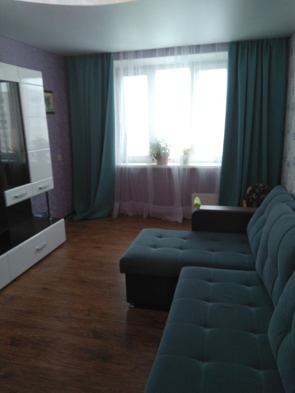 Обои сирень, диван бирюза.