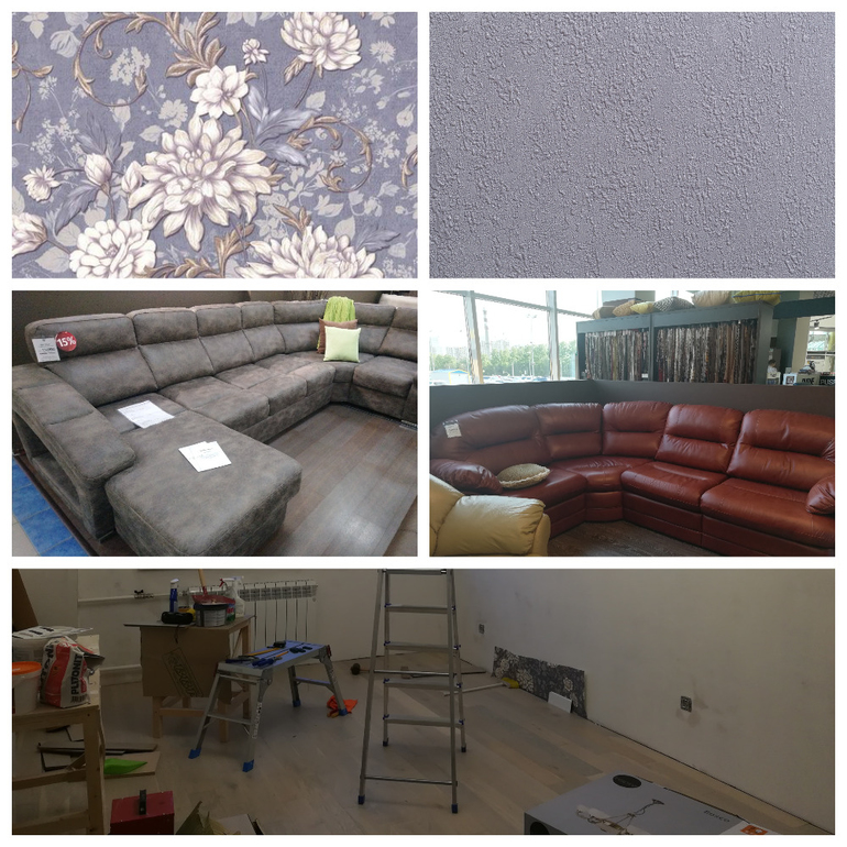 Прошу помощи, наводку на возможные цвета. Сейчас мы пока склоняемся к светло-бежевой коже. Коллаж ниже , обои уже выбраны, пол тоже, модели диванов выбираем из представленных