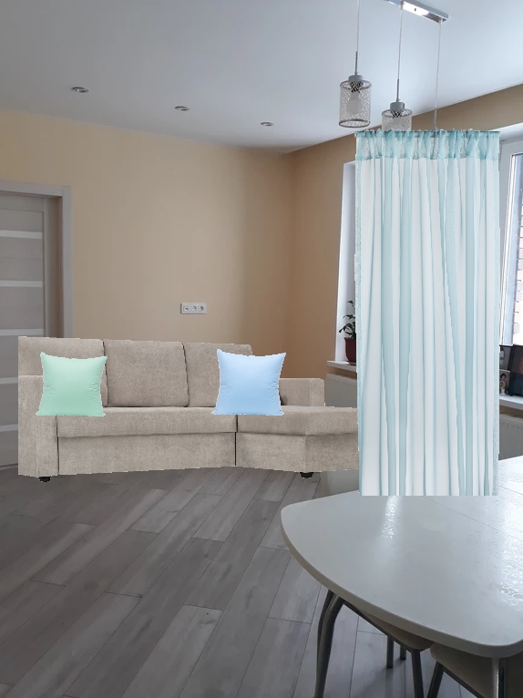 Я конечно, совсем схематично набросала. Но у вас чудесные и нежные цвета на фартуке) поэтому использовала их) диван бы сделала серым) в идеале как стулья, но будет маркий) или совсем наоборот голубой диван, а подухи серые и бежевые