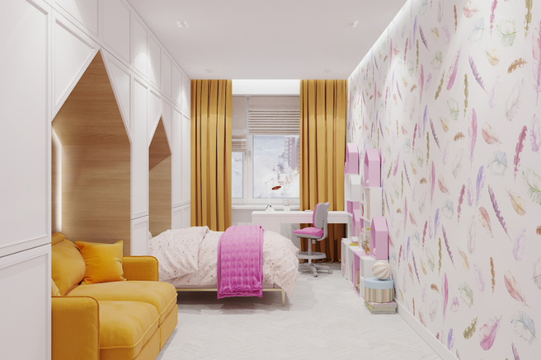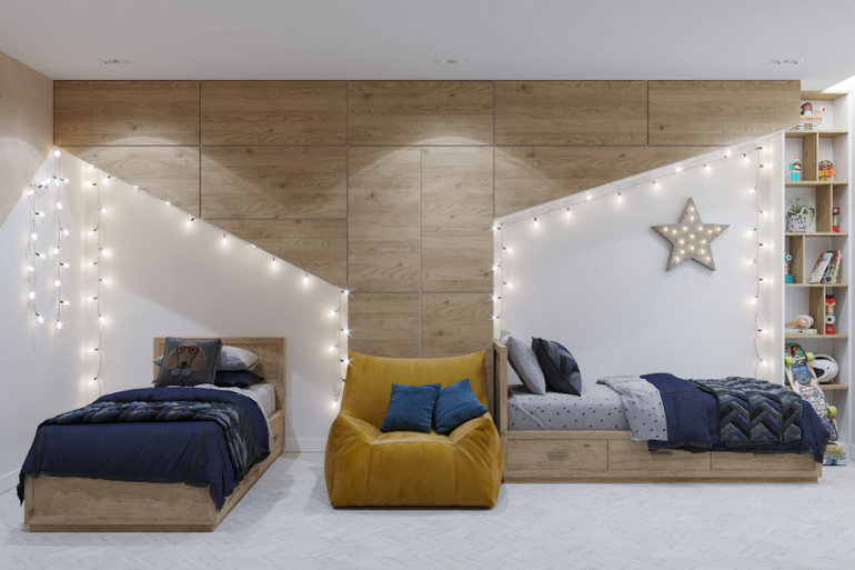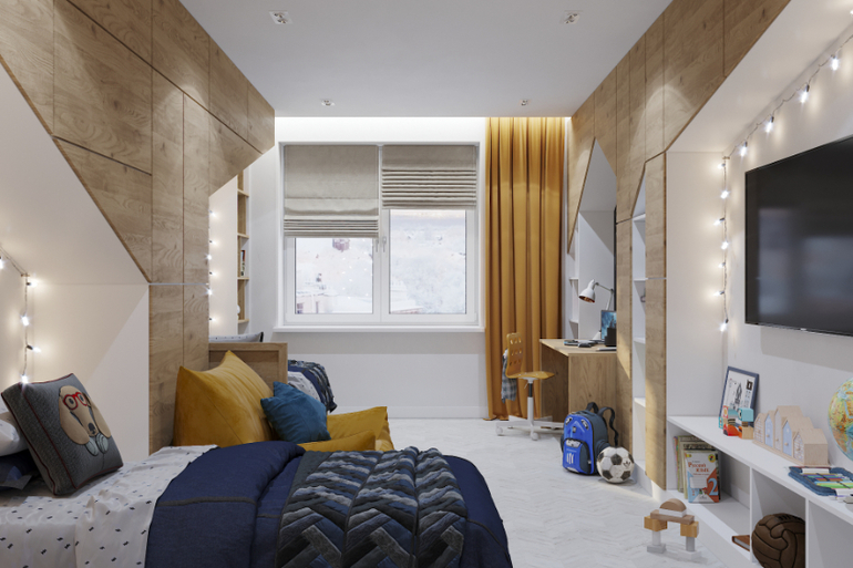 Кровати у мальчиков в нишу углублены. Глубина ниши 60 см. За креслом расположен полноценный шкаф. Кресло легкое бескаркасное)