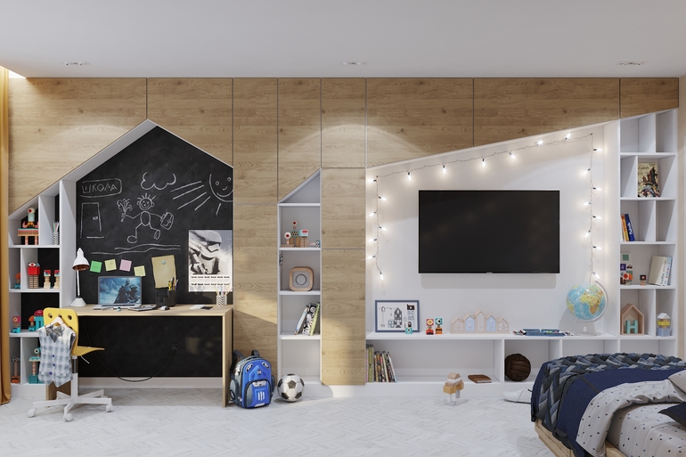 Вот я как раз у мальчишек понять не могу. У девочек шкафы ясно как расположены. Но у мальчиков же посмотрите как нарезаны панели- там же выемки. Узкие полосы, причем не от пола, а выше пола от выемок.