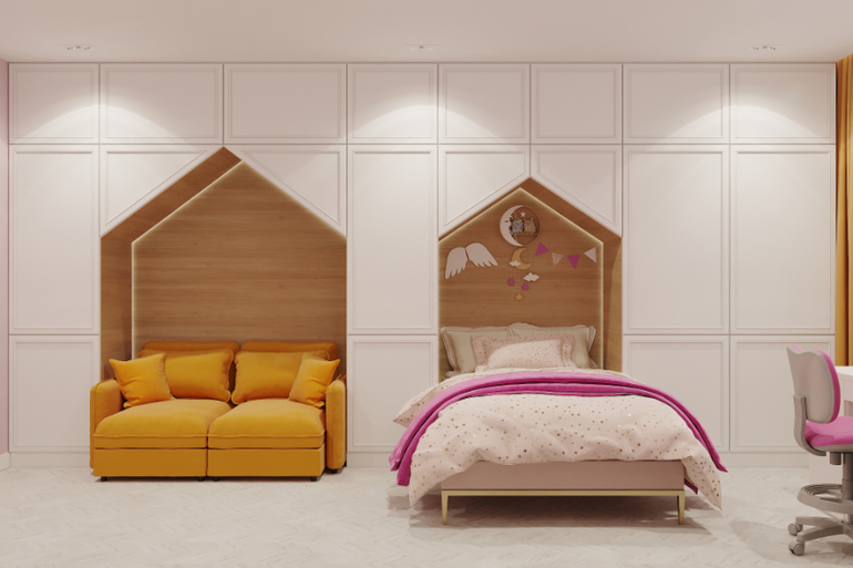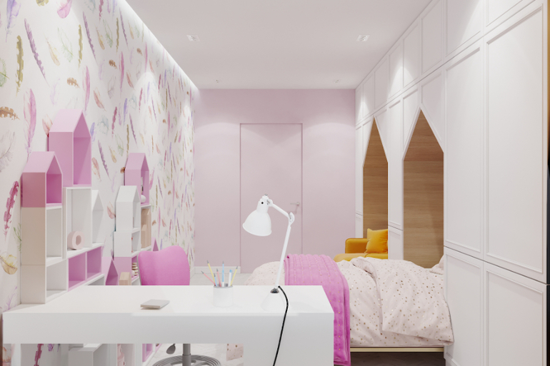 А в комнате для девочки, такие же шкафы но с белыми панелями.