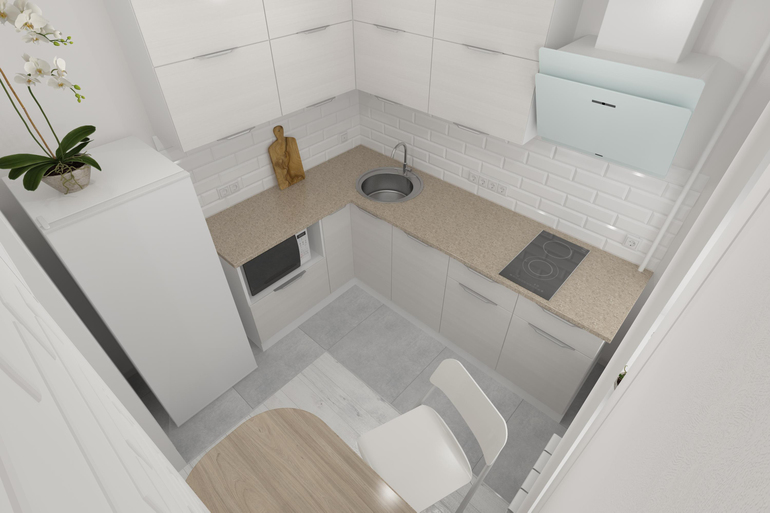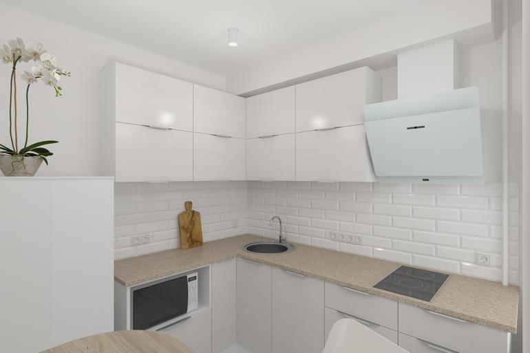 шкафчики на кухне невысокие( не до потолка ) функциональность в маленьком пространстве очень снижается...ну и снова белый.