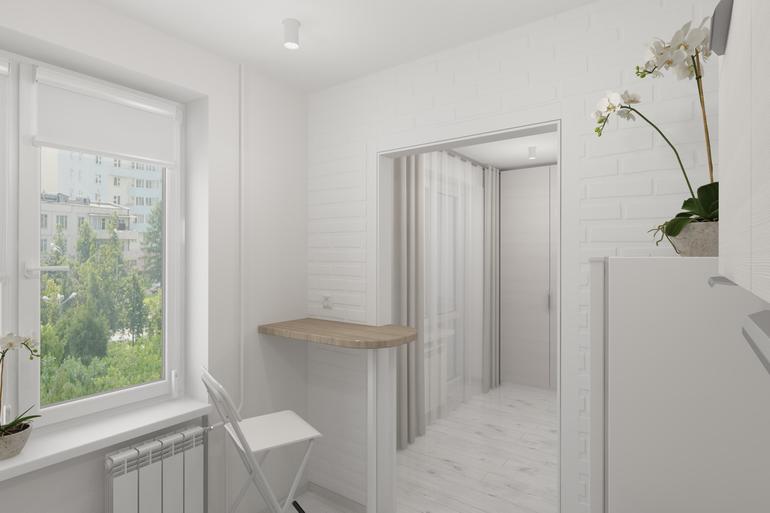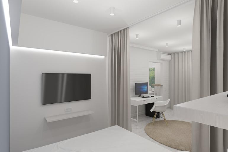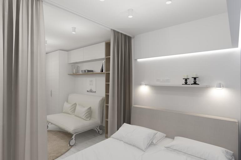 Мне нравится, даже на белый цвет согласна) Но смущает эта куцая барная стойка и кровать вплотную к стене. Будь она хоть 3 на 3 метра, неудобная при такой расстановке!