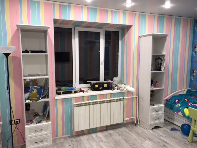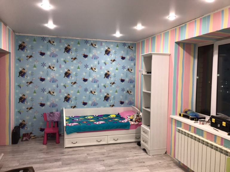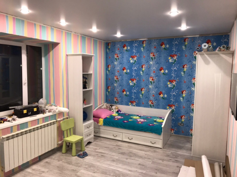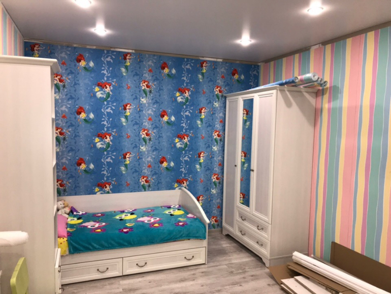 И по цвету не знаю еще(( Что бы Вы посоветовали? наверно, однотон? т.к. комната и так пестрит красками )) ну, вот так захотели наши девочки, сами выбирали себе обои ))