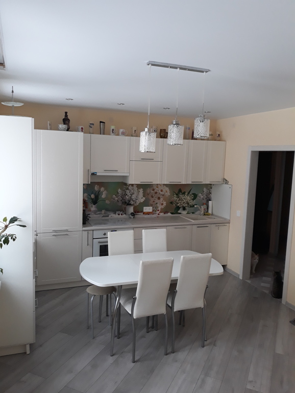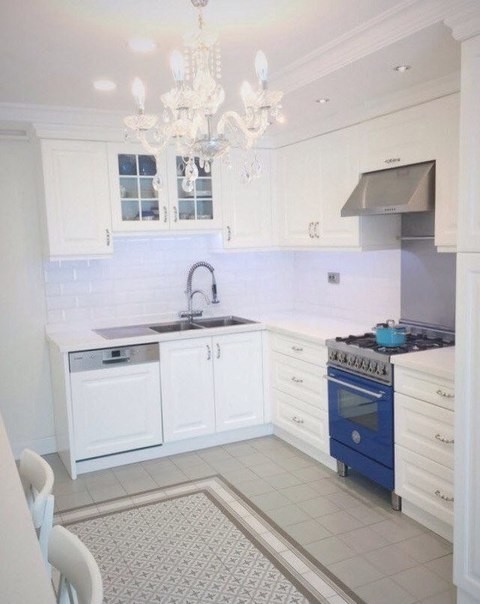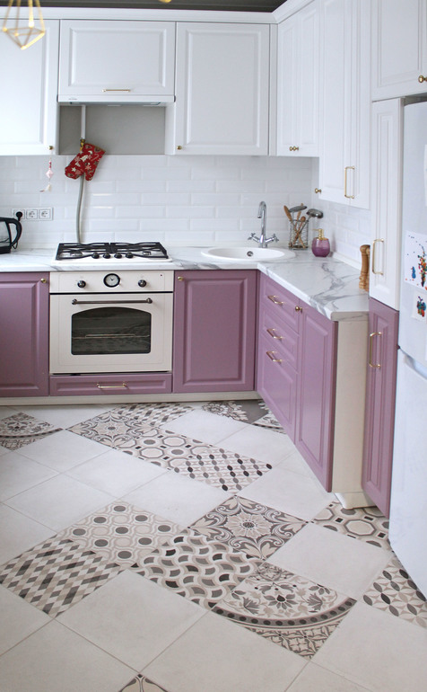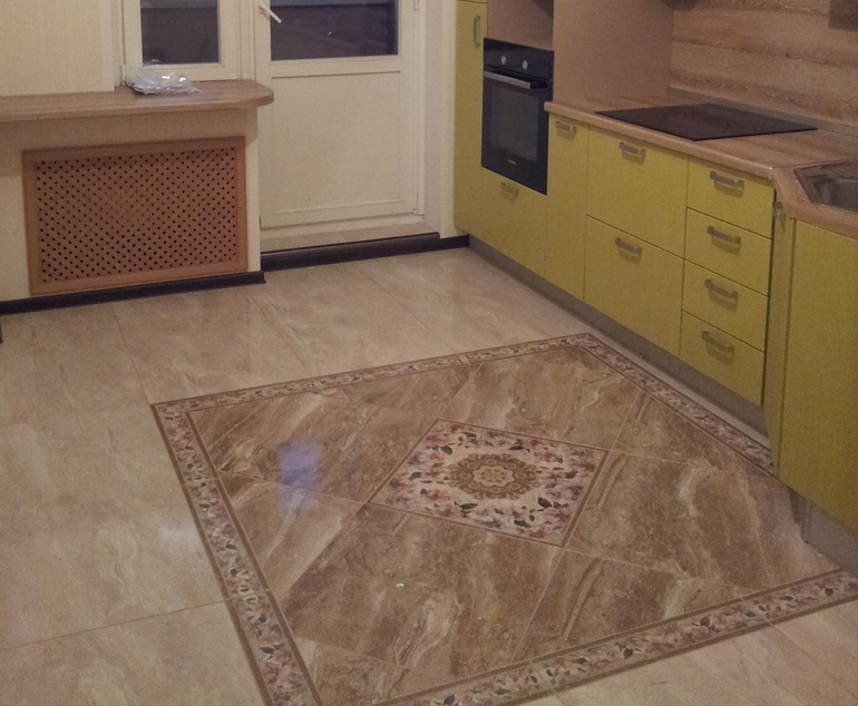 У меня у маман что-то подоброе. Согласно плану должно было быть центрованно между гарнитуром и противоположной стеной, но криворуких рабочих клинануло и "ковер" положили центрованно относительно стен, получилось прям под кухонным гарнитуром((( В итоге слева под окном поставили небольшой угловой диванчик и нормально смотрится. Что за плитка не помню уже, но скользкая зараза))) Фото с времен ремонта еще осталось: