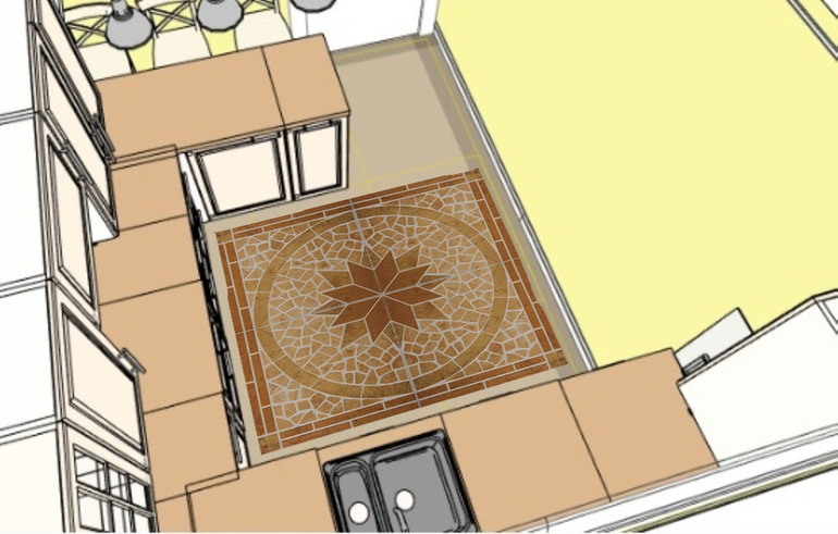 Если очень хочется ковер из плитки, почему бы не попробовать положить?) Только нужно исходить из модели кухни, во-первых. Во-вторых, из мебели, которая будет там находится помимо кухонных шкафов. По-моему, лучше положить что-то из мозаики, будет не так торжественно, и не будет диссонанса между гарнитуром и ковром. На Вашем фото ковер хорошо подобран, но неправильно выложен. И хорошо бы было добавить в него синие тона и какие-то бледно-желто-оранжевые. Чтобы оживить интерьер). Я прикинула на Вашем чертеже: