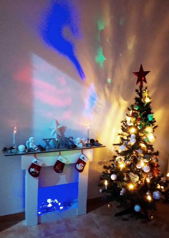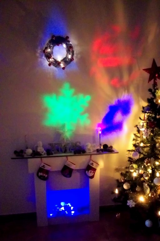 В темноте по просьбе сына включаю дополнительно проектор, который показывает крутящиеся рождественские мотивы: