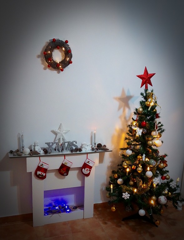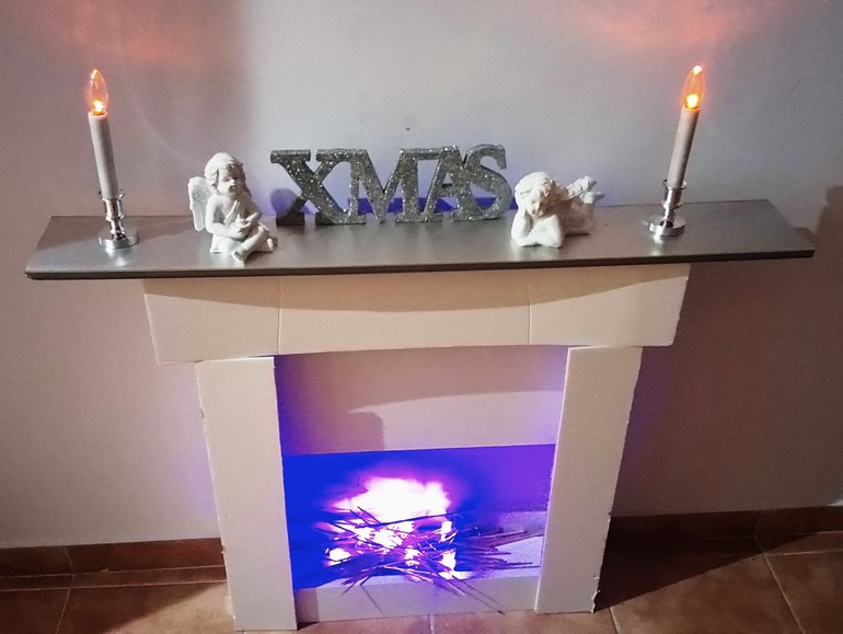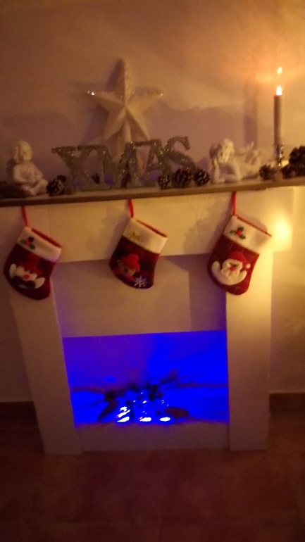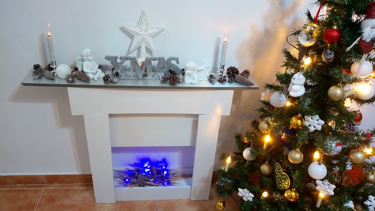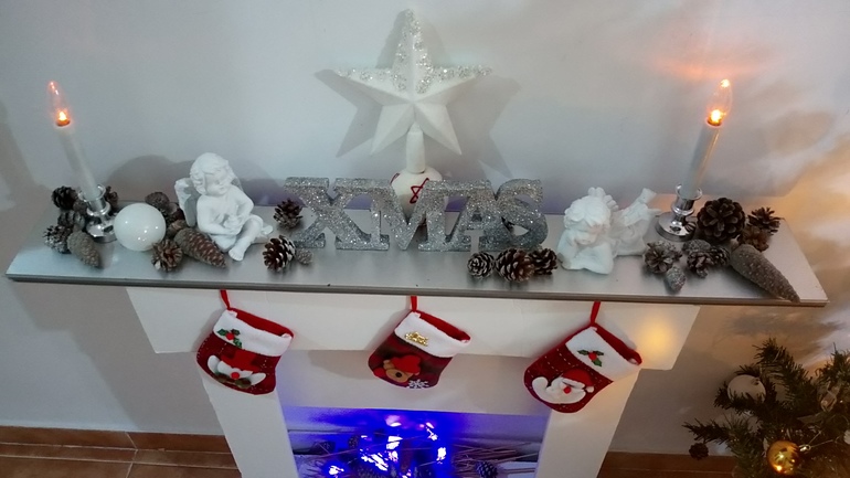 На камине поселились ангелочки из моего будуара и две ЛЕД-свечи. Надпись купила в китайском магазине: