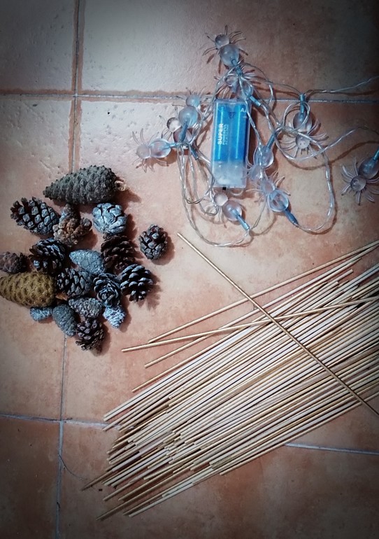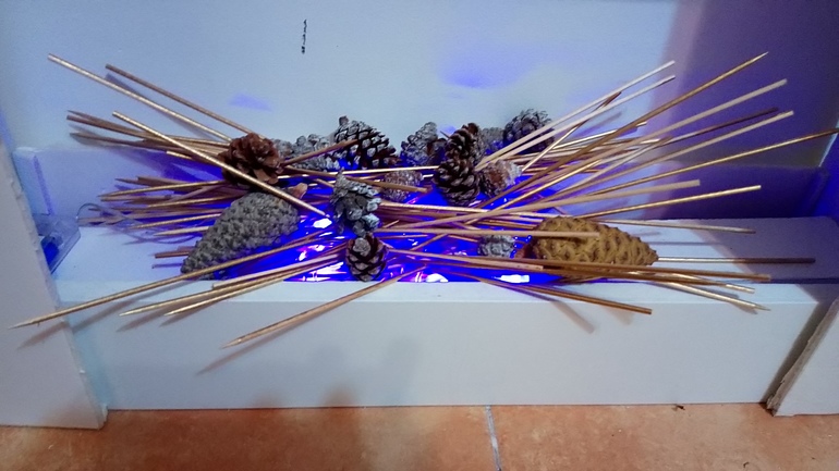 Положила хаотично шпажки, на них гирлянду, сверху шишки: