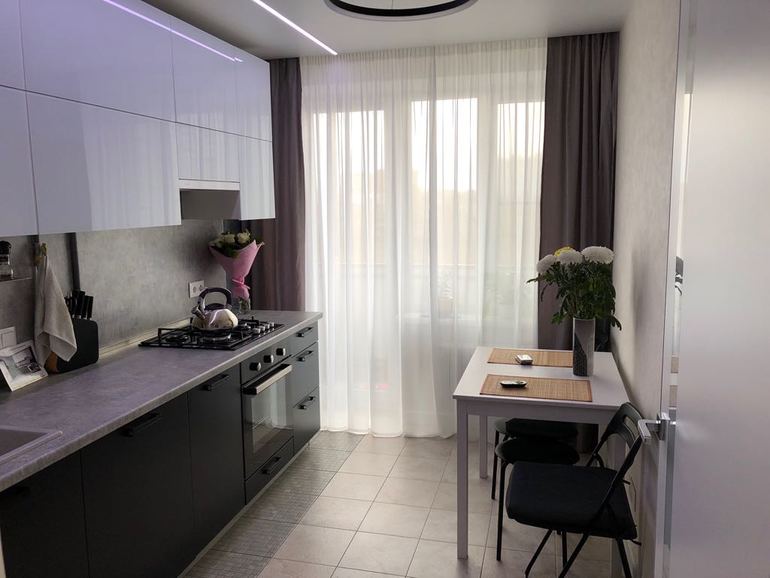 Люстру, занавеску - поменяла бы, если бюджетно. Телевизор у окна переместить. Кухня небольшая, очень много чёрного, которое ворует пространство.