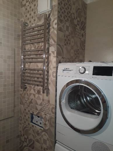 А Вы не хотите машины подвинуть правее, а шкаф ближе к унитазу сделать? Около унитаза стало бы посвободнее, а цвет фасадов бы подчеркивал плитку с декором по все высоте при этом.