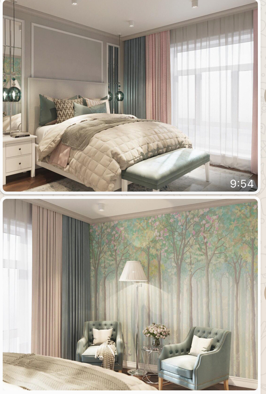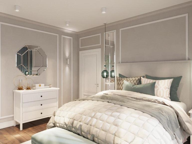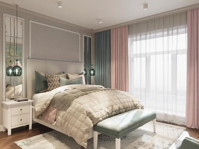 Классная спальня! Я бы только молдингов поубавила (или совсем убрала). Я, кроме штор, розового больше нигде не вижу. Стены серо-бежевые вроде. Что такое женская спальня вообще не понимаю... Это типа все замужние должны спать в комнатах, типа лофт, сканди и минимализм?..