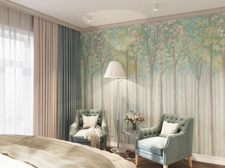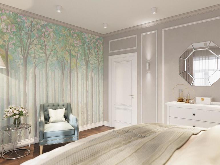 Мне все нравится кроме фотообоев. На мой взгляд Они больше в детскую подойдут или подростку. Я бы оставила стену однотонной.