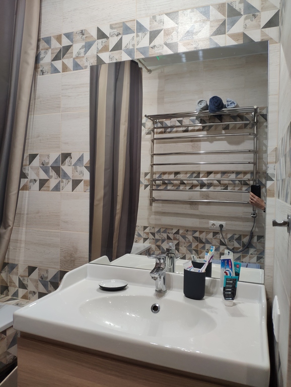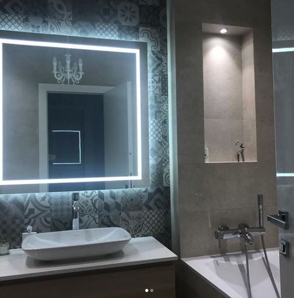 Интерьерное решение ванной комнатызанимаюсь ванной комнатой, вопрос с подсвеченным зеркалом встал. где как сделать чтобы зеркало не торчало сильно относительно плитки)