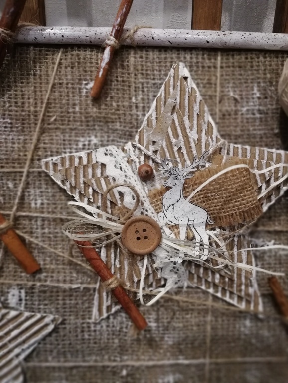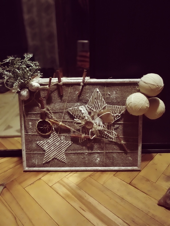Делали вместе с детками. Оленя полносттю вырезала Даша. Раму красили детки. Для звезд снимали верхний слой дети, и красили звезды краской. Композицию, сложную, на мой взгляд из отдельных элементов, совмещали с Лизкой.
