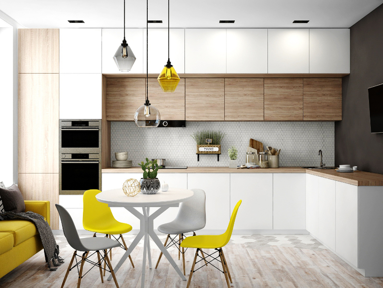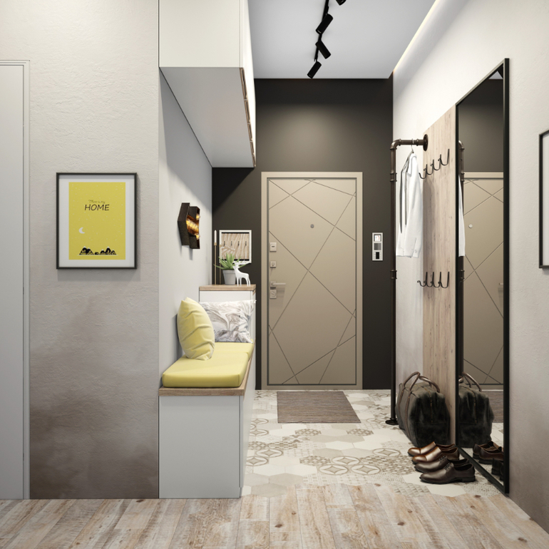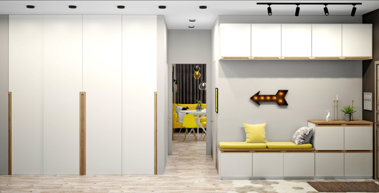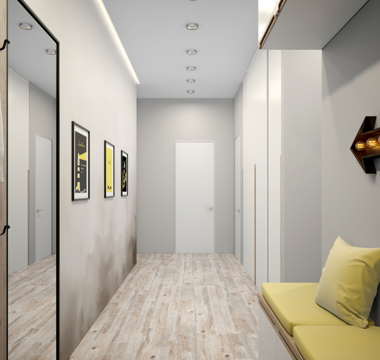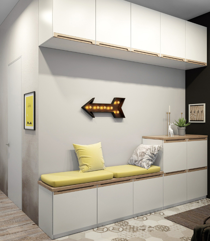Цветовая гамма была четко регламентирована заказчицей: белый, цвет дерева, серый, черный и желтые акценты. Только в гостиной и на лоджии я все-таки добилась немного отойти от концепции и добавить оранжевого вместо желтого (кто меня давно читает, знают, что это оксюморон, чтобы я сама предложила оранжевый=)).
