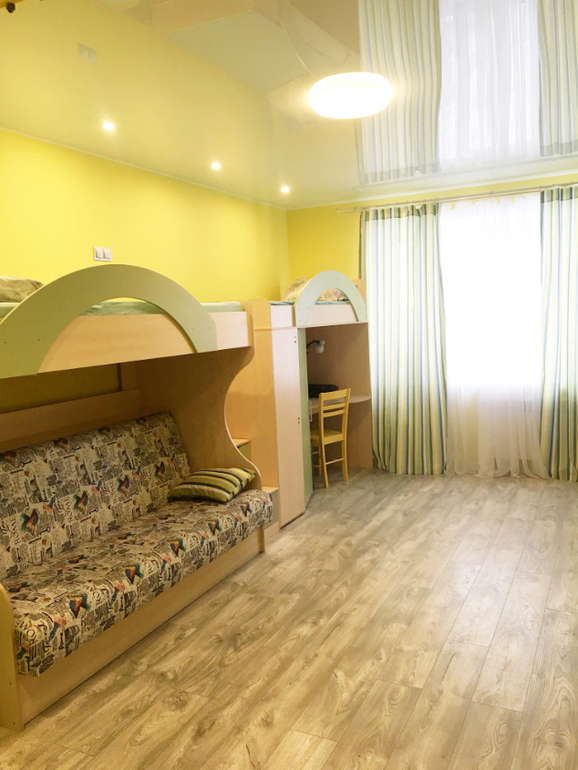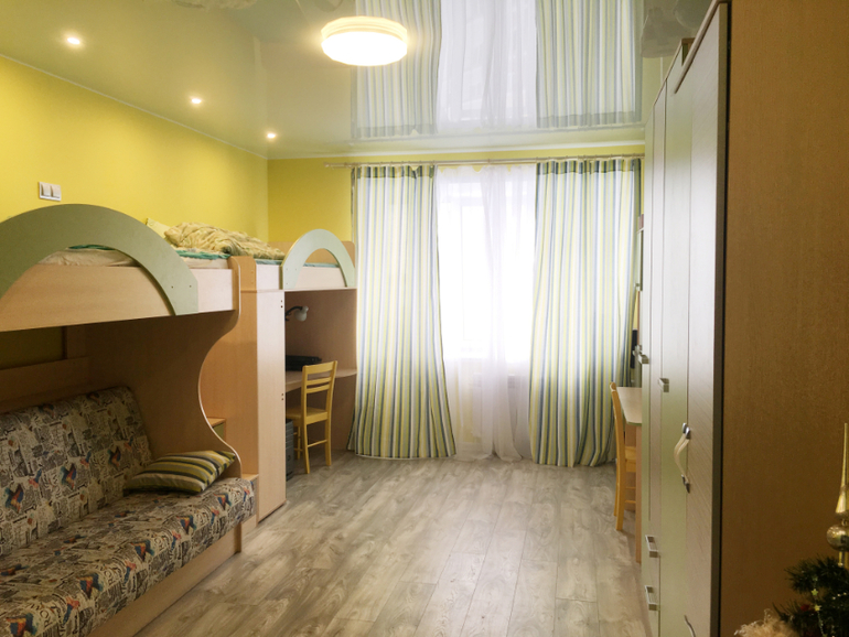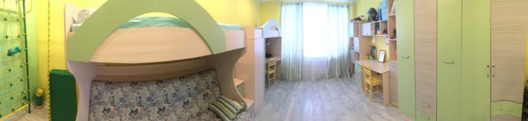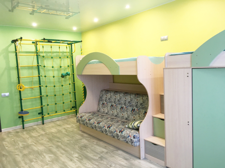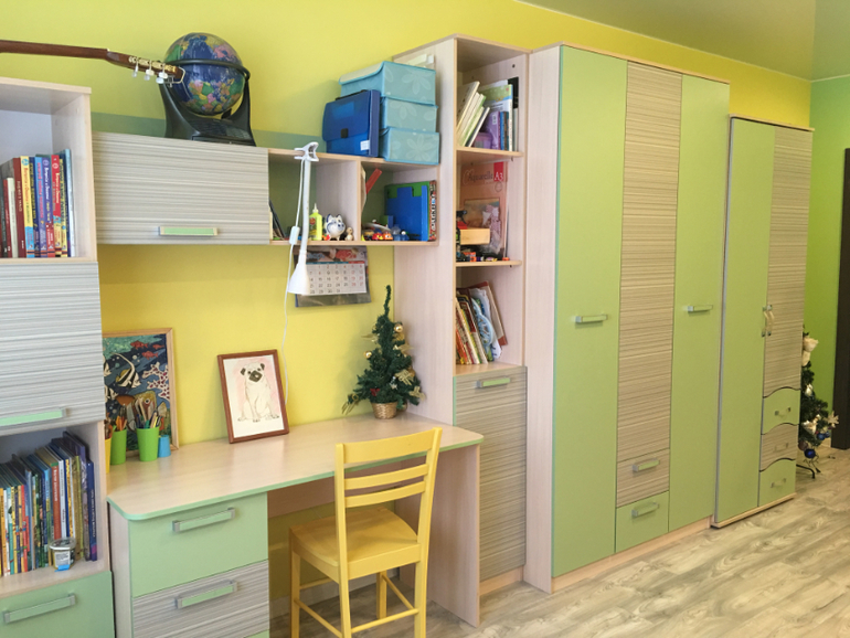 Детскую сейчас бы я поменяла совершенно, но был один уже шкаф из салатового детского гарнитура, под него и заказали все остальное. Стены выкрасили краской. Сейчас мне хочется детскую с акцентами великобританского флага и Лондона, но думаю для мальчишек 6 и 8 лет пока желто-зеленый солнечный вариант со спортивным уголком подойдет. А подрастут и поменяем. Пока на мебель из массива мы не накопили, чего уж говорить про дизайн детской, все равно игрушки все забивают...