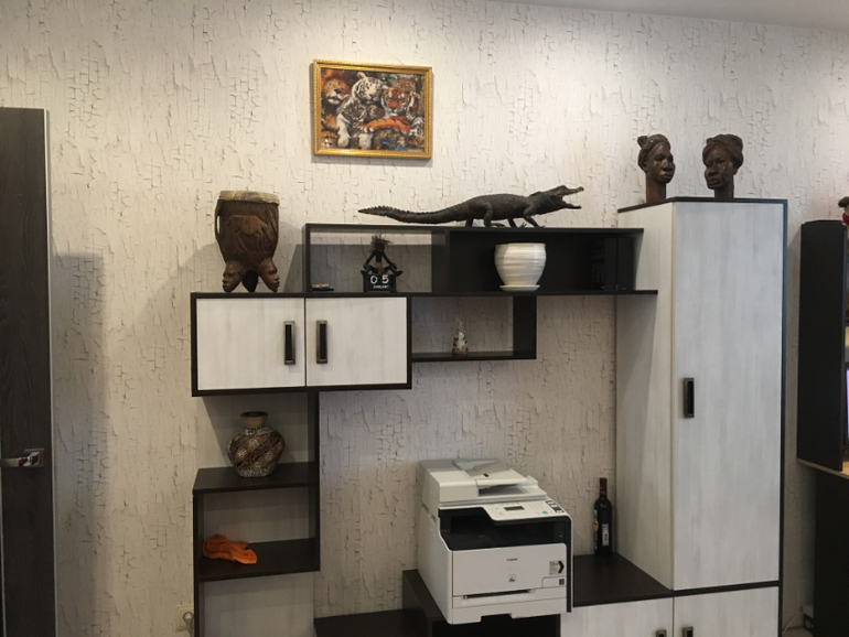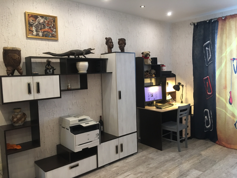 На стенку планируется телевизор, но он на последнем месте в списке нужного, потому что осбо его никто не смотрит, только фоном. Картина над стенкой тоже временная, просто подарили. Потом заменим когда найдем подходящую. Ну и компьютерный стол мне совсем не нравится, но мужу обязательно хочется чтобы был с полочками вверху и шуфлядками внизу... Но я посмотриваю в интернете современное оформление рабочих зон, но в большинстве своем это маленькие столы и ноутбуки, а задача стоит максимально хлам убрать с глаз, ноут не прокатит... Если есть идеи стенки и рабочей зоны предлагайте )))