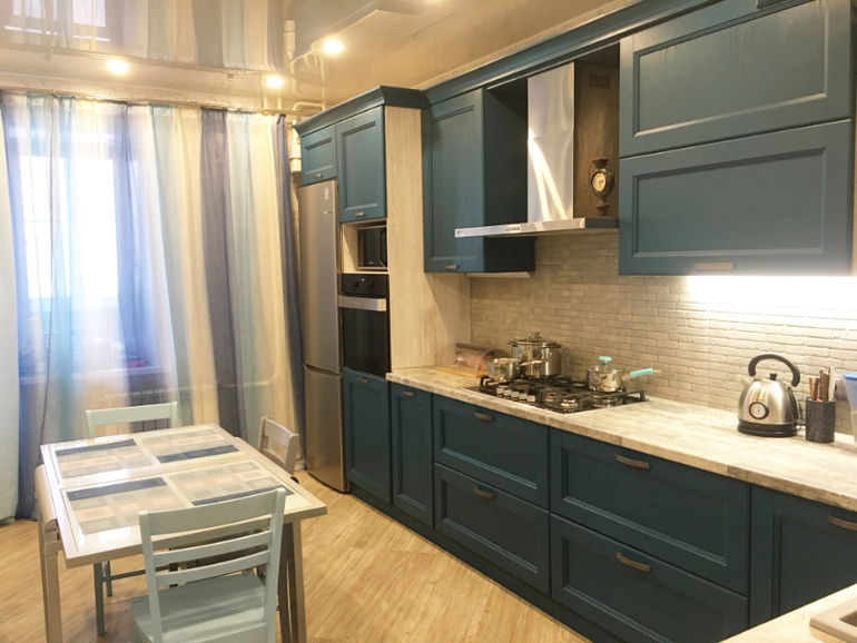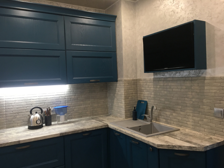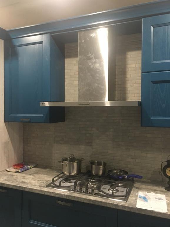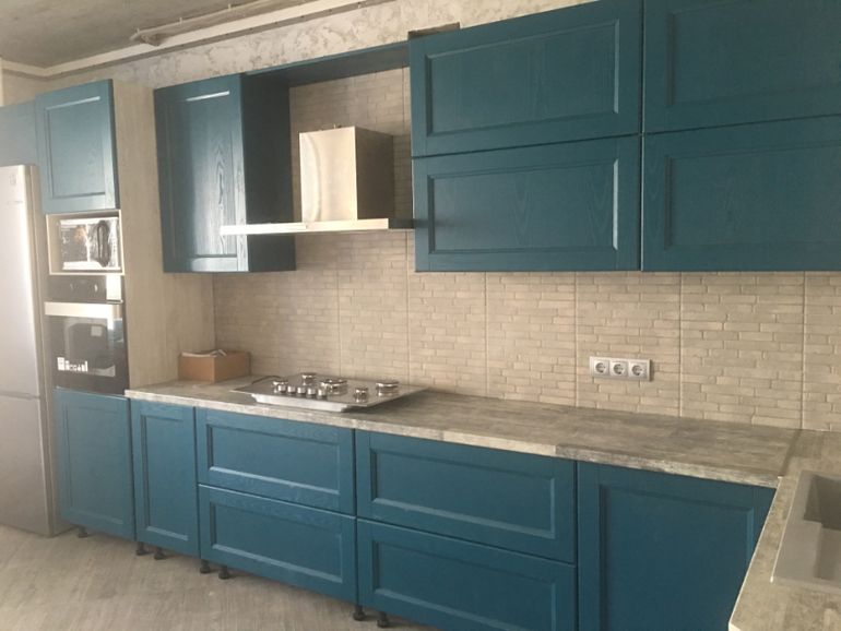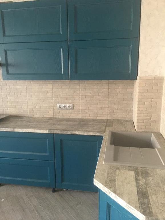 По поводу кухни тоже было полно страданий, но мало времени ходить выбирать. Как то пришла в один салон и быстро набросали проект кухни углом. Сейчас бы я уже просила рссмотреть всю комнату целиком, потому как оформление обеденной зоны и противоположная стена кажется пустой... После выбирания керамогранитной плитки на пол под дерево с небольшим оттенком серого хотелось, чтобы где то дерево реально присутствовало, чтобы хоть что то было настоящим, поэтому и заказала фасады из массива (хотя стоимость его у знакомого, что делал кухню вышла даже дешевле, чем в салоне насчитали шпон: 80 тыс деврцы из массива в МИАС-мебеле, 45 тыс фурнитура блюм и 60 тыс остов со столешницей и работой, а в салоне кухни от 200 тыс насчитывали). Я из тех людей которые абсолютно не считают правильным, что кухня должна быть белого цвета. Прошлая кухня у меня была ярко красная со стальным и серым. А тут тоже хотелось что-нибудь этакого и под действием момента я заказала фасады сложного цвета бискальского залива сине-зеленого (ну видимо луна была в скорпионе как пишут на сайте вдолевка)... Такого цвета даже в образцах не было, выбрала его по колеровке. А потом мучалась и здесь спрашивала совета какой фартук выбрать. В итоге остановились на плитке кирпичиком, но не надоевшим кабанчиком. Правла мне думалось раскладка быдет кирпичная, а не рядами, но что-то у плиточника пошло не так...