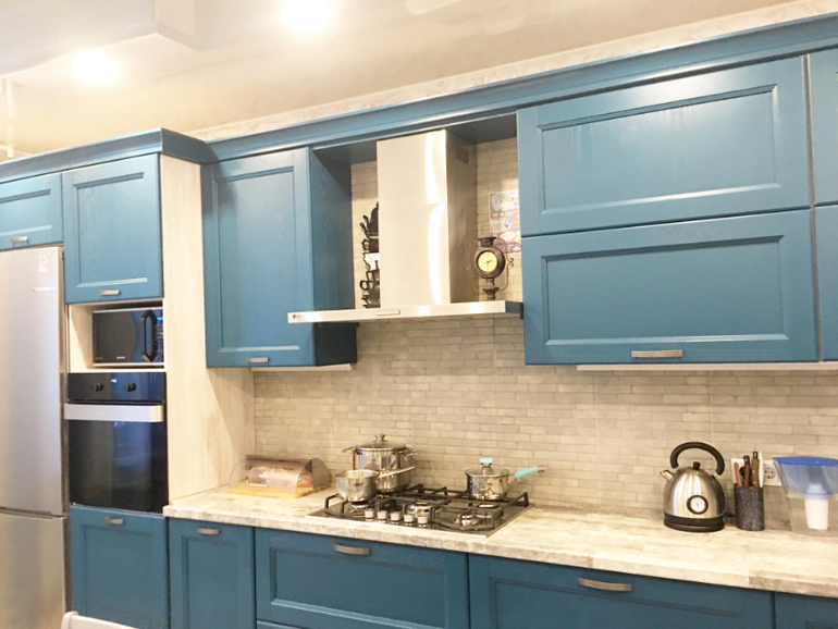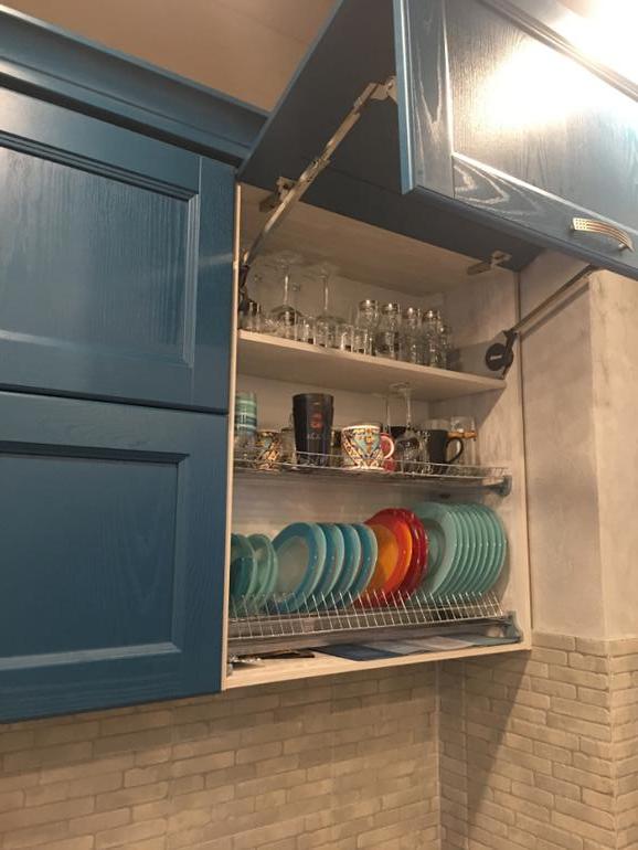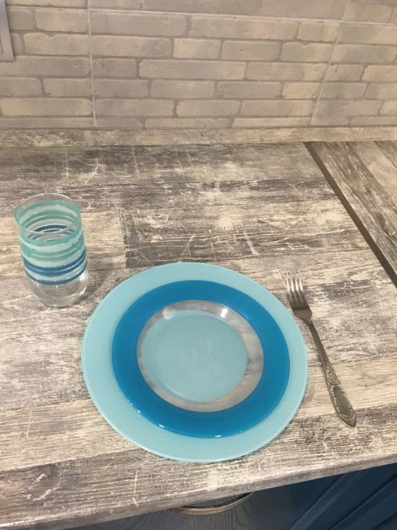 Под этот бискайский залив оказалось хорошо подходит светло-бирюзовый, а его выбор есть. Даже посуду в ленте дешевую (скидка была 50%) нашла подходящую, но бирюзовых тарелок полно, а синих взяла остатки всего пару штук. Жду когда появятся нужные глубокие суповые, а то с прошлой кухни красными приходится пользоваться. Столешница серенькая в любимом стиле "обшарпэ" )))
