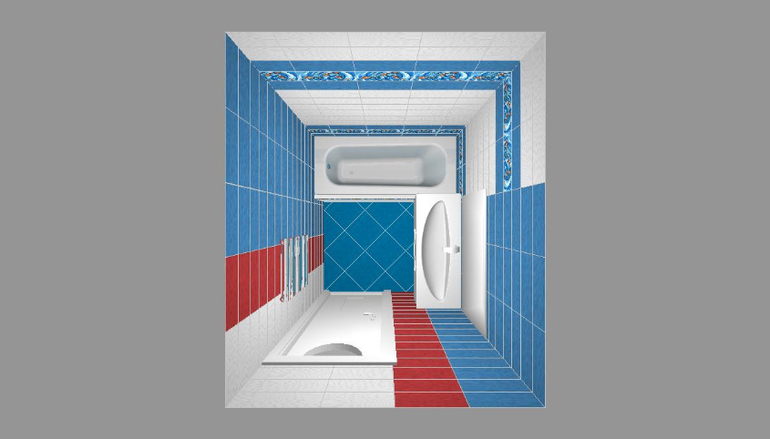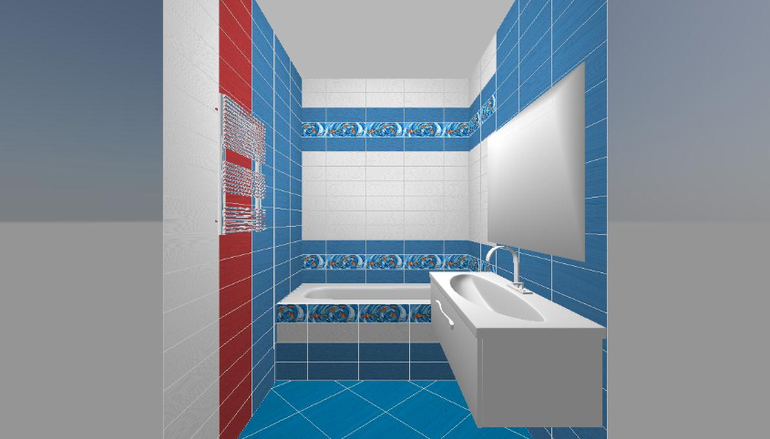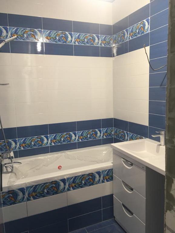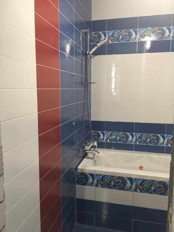 С выбором плитки замучались. Я хотела сине-бело-красную, немного в морском стиле, но без пошловатых дельфинов и подводного царства. То, что в магазине понравилось бело-синее с каплями воды крупным планом было запредельно дорого (декор был под 10 тыс). Поэтому когда увидела всю коллекцию Салерно керамо марацци, а не только парусники как в магазине на выставочном образце уже согласились с мужем на этот вариант, так как ходить по магазинам уже надоело. Там как раз были плитки и синего, и белого и красного цветов, а декор с золотыми рыбками карпами кои. Я до декрета изучала вирусы рыб и хотела впервые в России выделить вирус карпов кои, но не успела. Так что подумалось, что это судьба и плитка была заказана. Вот такую раскладку сделали нам в магазине