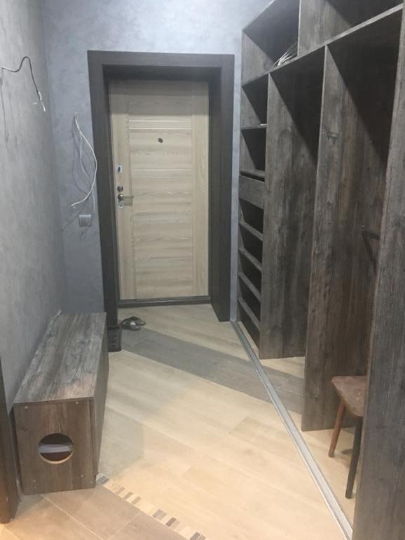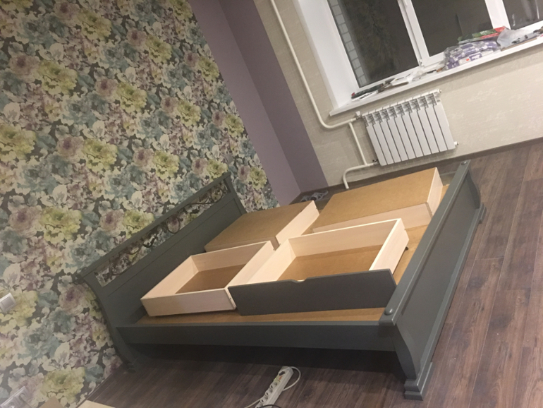 Кровать заказала серого цвета чтобы хоть немного отличалась от ламината, который единственный в квартире сложного коричневого цвета с серо-зеленым отливом горизонтально (почему его выбрала сейчас вообще загадка, видимо опять луна в скорпионе и не хотелось везде светлый стелить). А шкаф купе из сосны пасадена чтобы подходил и под кровать, и под двери, и под пол. Правда вставки должны были быть другого цвета из стекла, но с производителем не поняли друг друга, но переделывать не стали вспоминая как затаскивали эти двери на 9 этаж, потому что они на 5 см не вошли в грузовой лифт.
