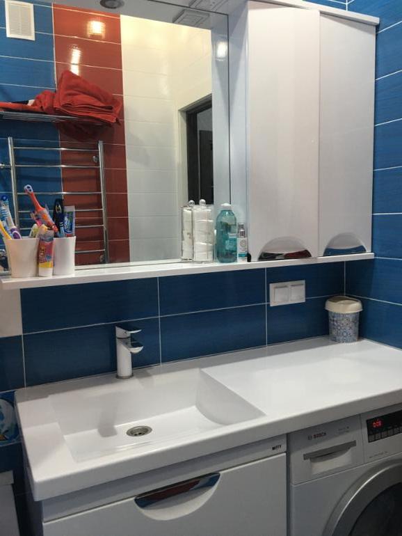 Сразу решили, что перепланировкой заниматься не будем: некогда, да и средств не много. Опасения вызывала слишком маленькая ванна, но решили, что впишемся и переживем. Душевую кабинку не хотелось из-за стеклянных перегородок, а ванна как раз встала от стены до стены поперек, а перпендикулярно как раз встала тумба Куба с большой столешницей под стиральную машинку и конечно и раковиной. Сейчас то я уже почитав в интернете, знаю, что можно было заказать и отдельно столешницу из камня, и раковину накладную... А тогда увидела единственную во всех магазинах такую тумбу с раковиной, да еще и шкафчик с зеркалом можно было к ней заказать, то все с расстановкой мебели в ванной и решила. И бюджетненько вышло.