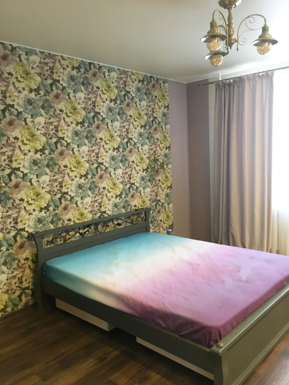 Купила сатиновое постельное белье с эффектом омбре от бирюзового до фиолетового цвета под обои и вообще балдею. Покрывало подарили, думаю заменить на фиолетовое.