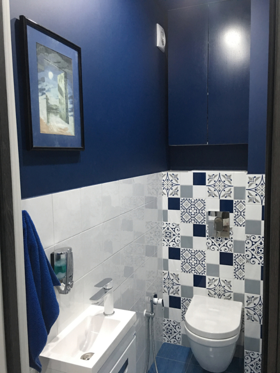 Оставить нишу над инсталяцие под картину не могла себе позволить моя внутренняя плюшкинская сущность - "а бытовую то химию где хранить??? ванна то малюсенькая, там негде... кладовки тоже нет" и хоть и не нашлось фасада подходящего цвета, хотя персмотрели все у заказчиков кухни, я заказала белый шкафчик и просто перекрасила фасады сама нужной краской.