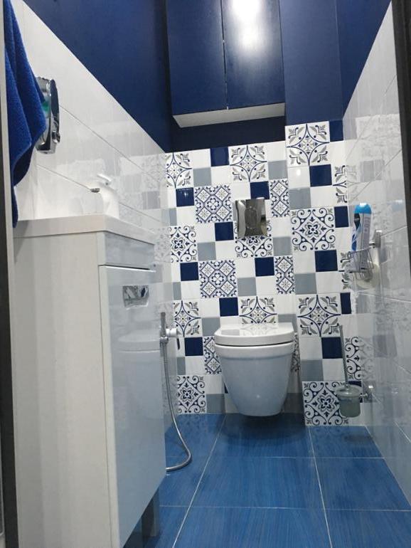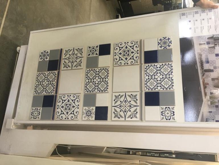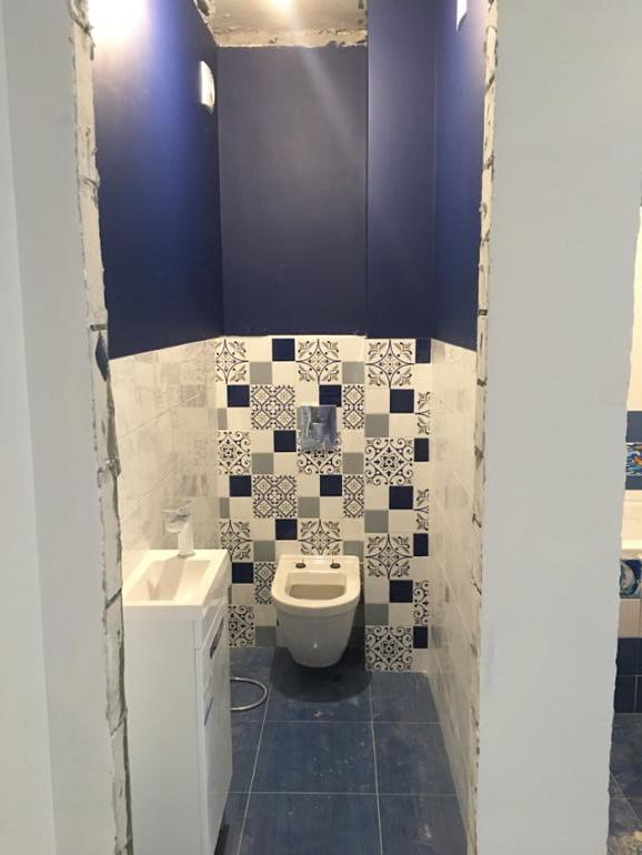 Ну или почти такой: белый кабанчик не хотела, думала заменить белой плиткой. И опять начались хождения по магазинам в поисках синей плитки с печворком. И все опять было всё не то, но случайно в дешевом отделе увидели отечественную плитку.