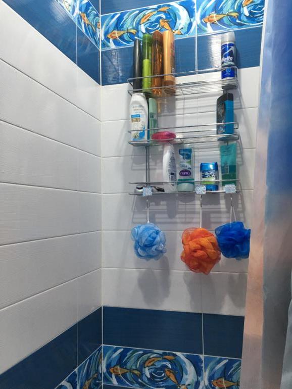 Полка для шампуней и гелей для душа за шторой, бардака не видно. Из минусов - хромированные краны. Все капли воды высыхая оставляют следы... Каждый день приходиться вытирать по несколько раз. Больше никогда в жизни не поставлю такие... Уже начинаю подумывать может быть можно чем то заклеить хромированные поверхности? И сам вентканал в туалете, а между туалетом и ванной только решеточка, в итоге зеркало запотевает даже если принимать душ...