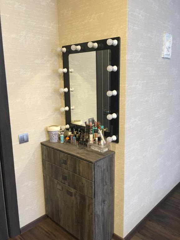 А при входе в нише от выступа ванны сделала себе туалетный столик с гримерным зеркалом. Я привыкла красится стоя и вплотную к зеркалу, поэтому туалетный будуар с креслом или пуфиком вот совсем не нужен. А при входе потому что встаю раньше мужа и чтобы максимально ему не мешать...