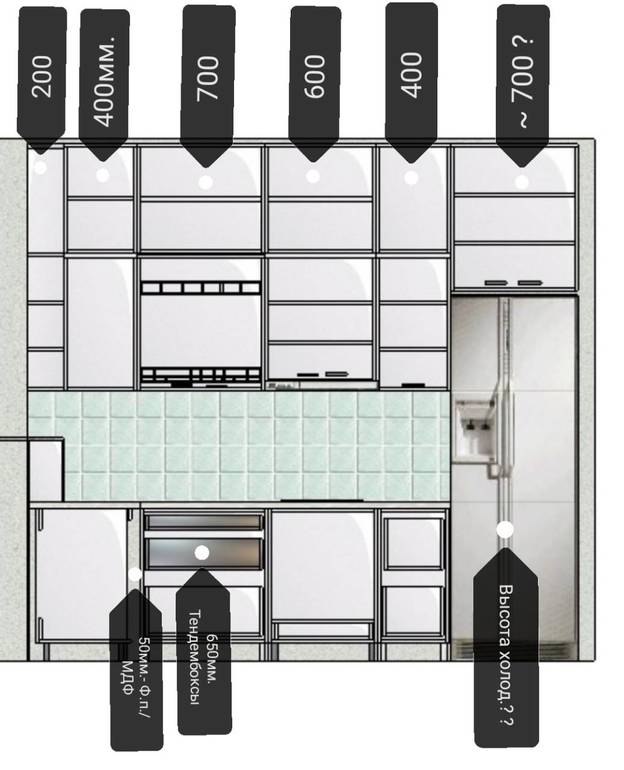 Сверху дверцы нижний ряд с ручками, верхний от нажатия. Под потолок. Над холодильником скорее всего делать не будем. В выдвижных сверху тандембоксы. Или лучше сделать сверху узкий ящик для столовых приборов,а большой выдвижной снизу с тандемом? И не знаю вверху как удобнее распашные или подъёмные? Пока распашные. Где 400 вверху ящик,ниже сетка под бутылки. Может поменяли бы что?