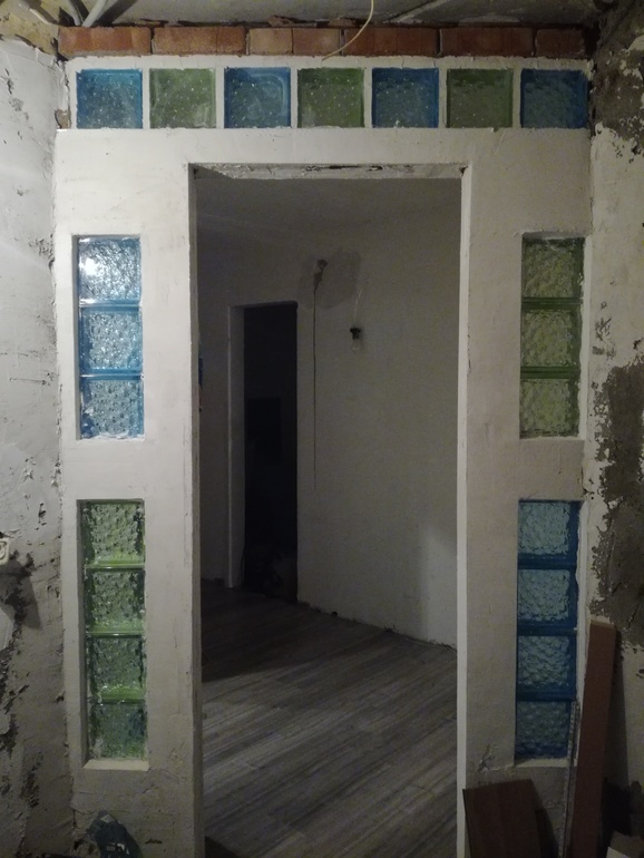 Доброе утро ! Как оказалось,я не дизайнер и человек без вкуса,помогите советом ))) Это дверь из ванной , отделана стеклоблоками ,задумка прежнего хозяина,продавшего нам квартиру в стадии глубокого ремонта .Предстоит выбрать плитку ,надо мне по цветовой гамме "привязываться " к стёклышкам ? Мои предпочтения светлая плитка с контрастным декором,может со стеклянным бордюром ...Или не брать по цветовой гамме стеклоблоки в расчет, а просто дополнить ванну подходящими по цвету ковриками и т.п ?